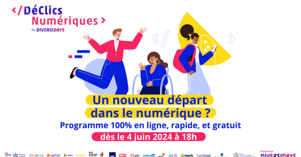 Diversidays, association nationale de référence en matière d’égalité des chances en France, est fière de lancer la 17ème édition 2024 de son programme DéClics Numériques : un programme en ligne, gratuit et ouvert à tous et toutes qui vise faciliter la reconversion de toute personne en recherche d’emploi ou en reconversion professionnelle dans les métiers du numérique.